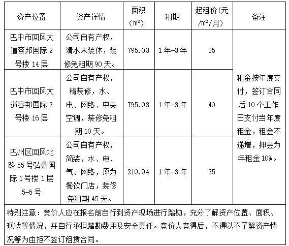 根據(jù)國(guó)有資產(chǎn)管理相關(guān)規(guī)定,巴中自然資源投資集團(tuán)有限公司決定對(duì)相關(guān)資產(chǎn)進(jìn)行公開招租。現(xiàn)將有關(guān)事項(xiàng)公告如下: